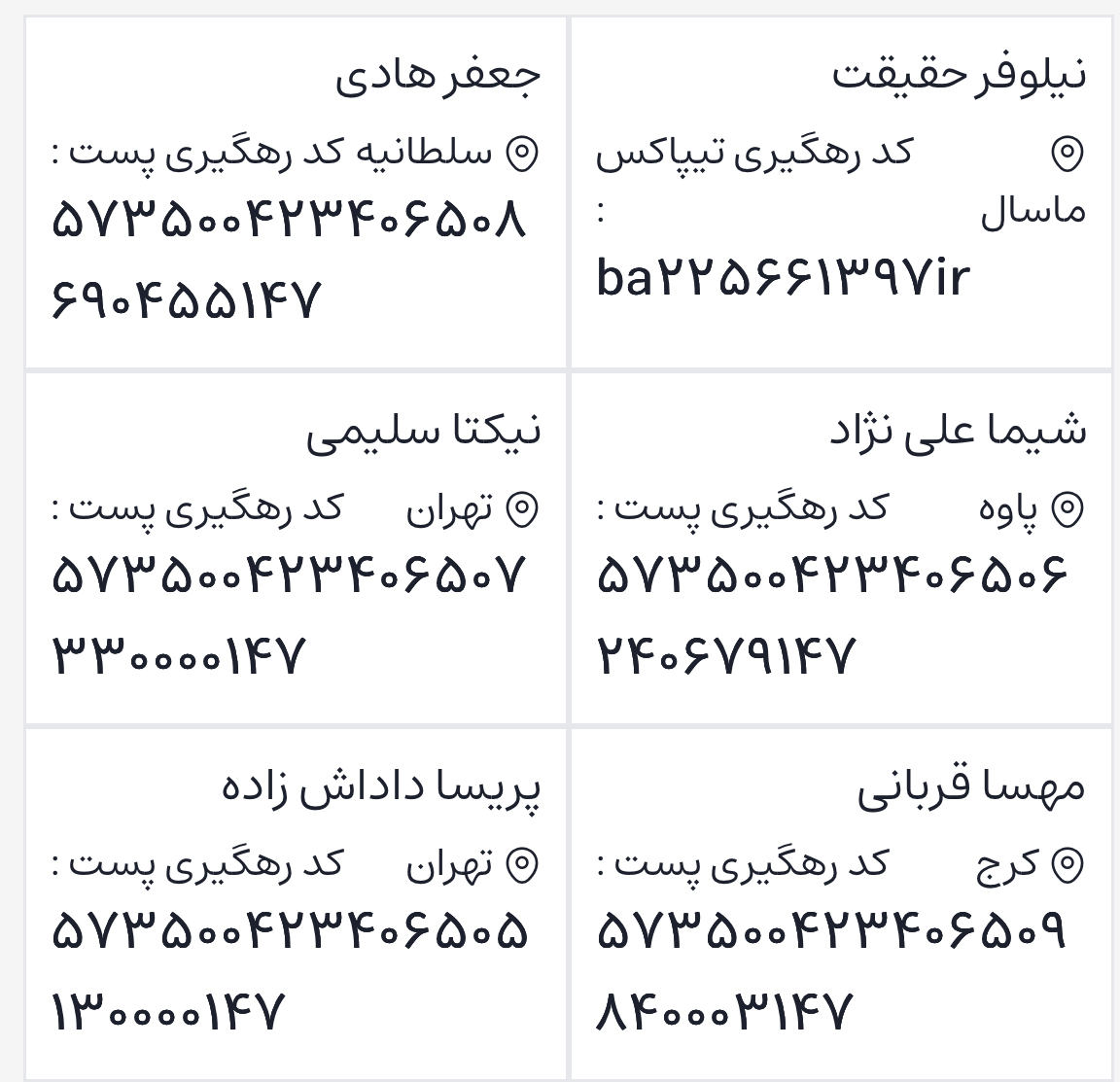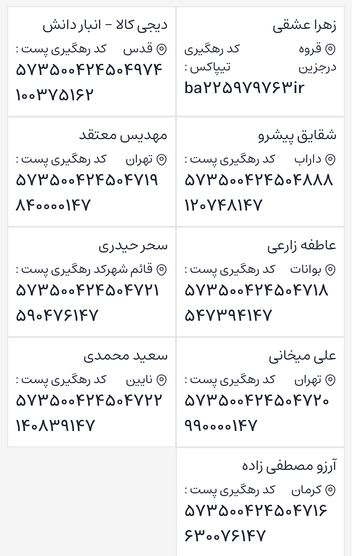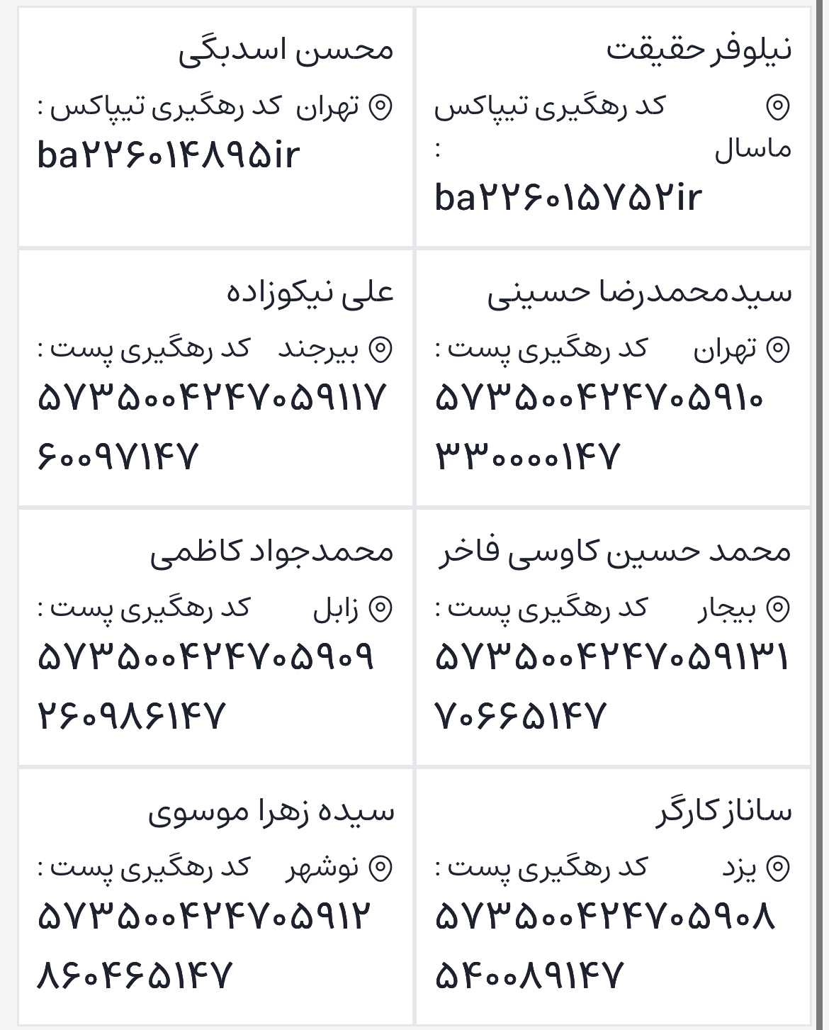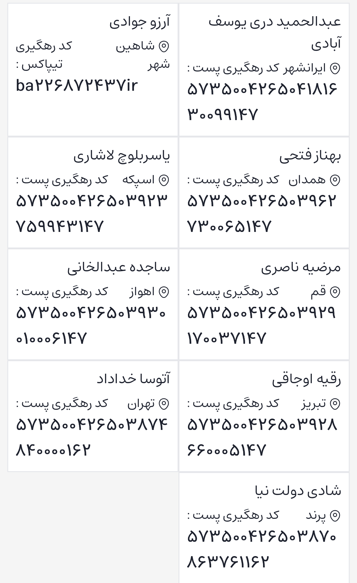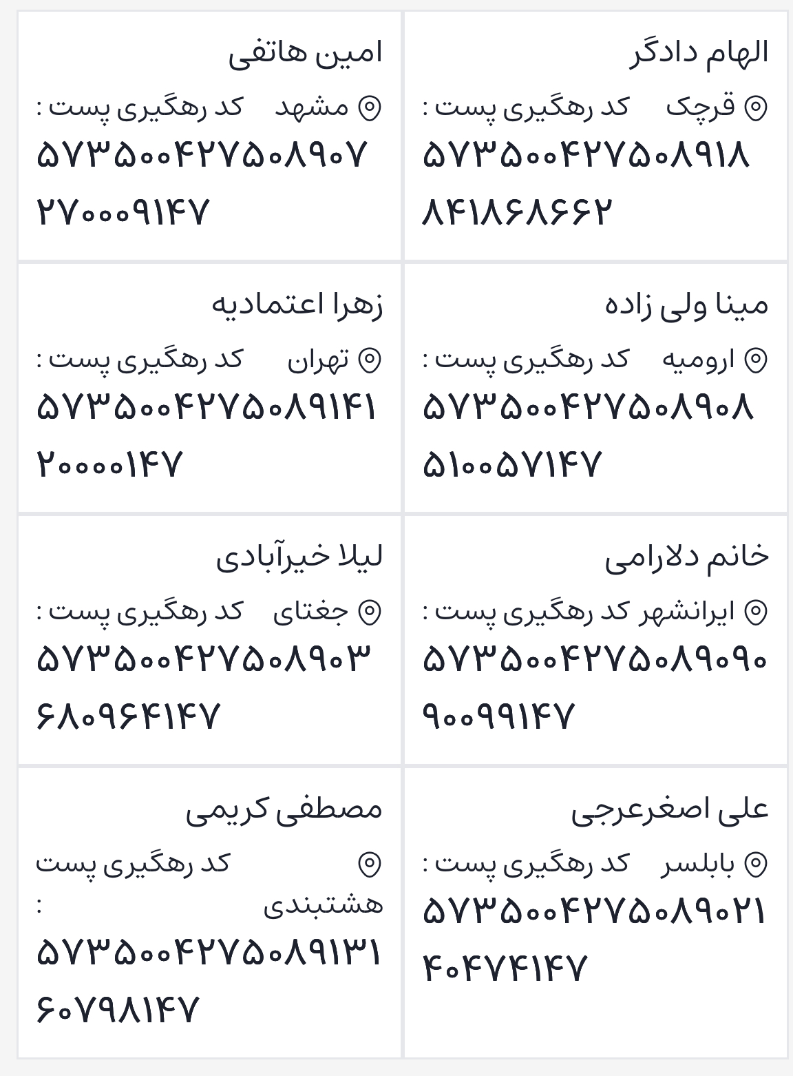 با سلام و وقت بخیر، شما عزیزان میتونید با استفاده از کد رهگیری از طریق سامانه رهگیری مرسولات پستی و سامانه تیپاکس، سفارش خودتون رو پیگیری کنید و بدونید دقیقا کجاست.