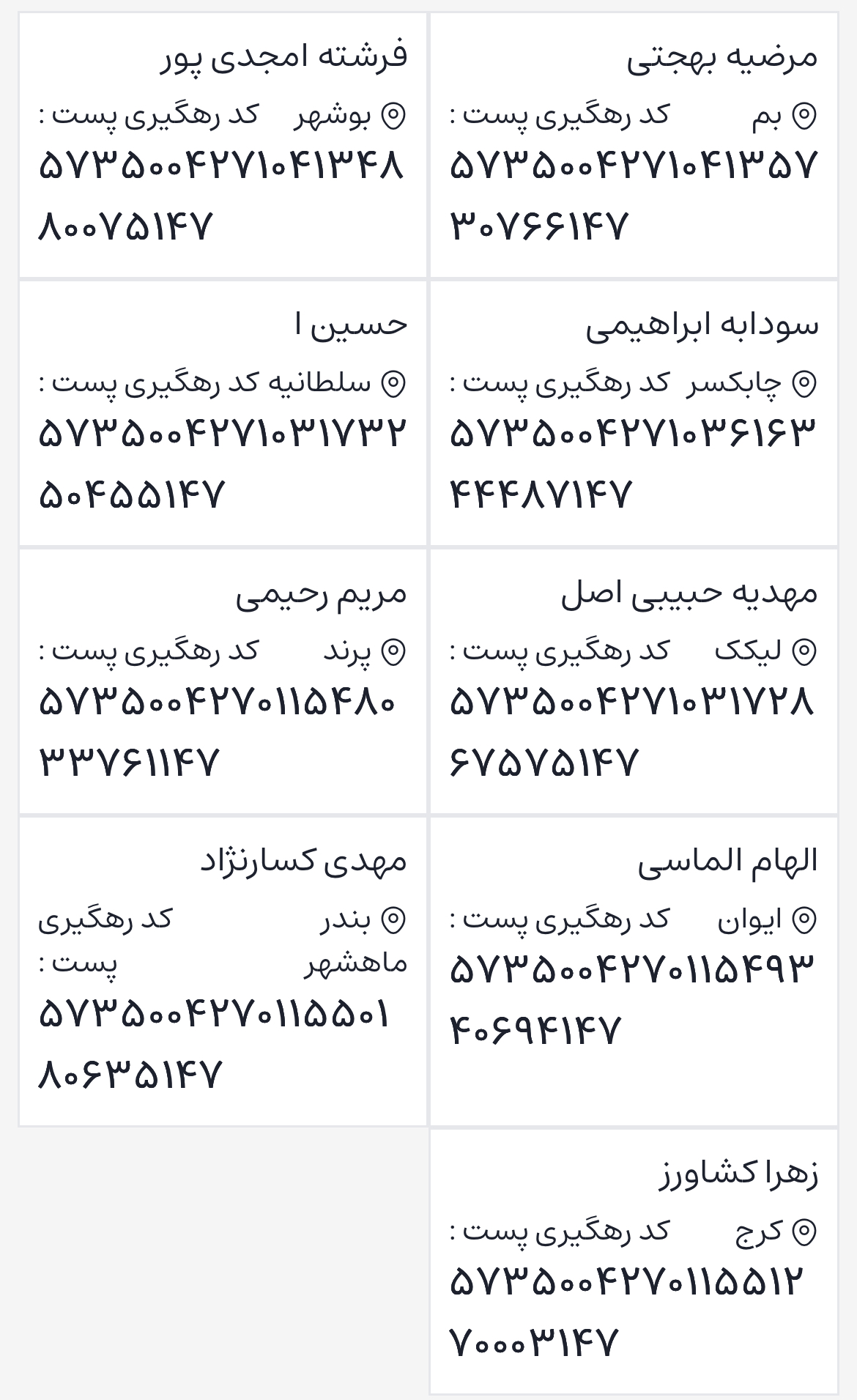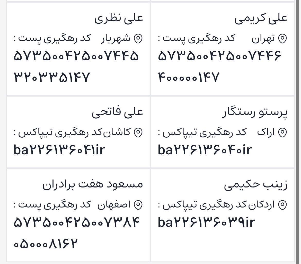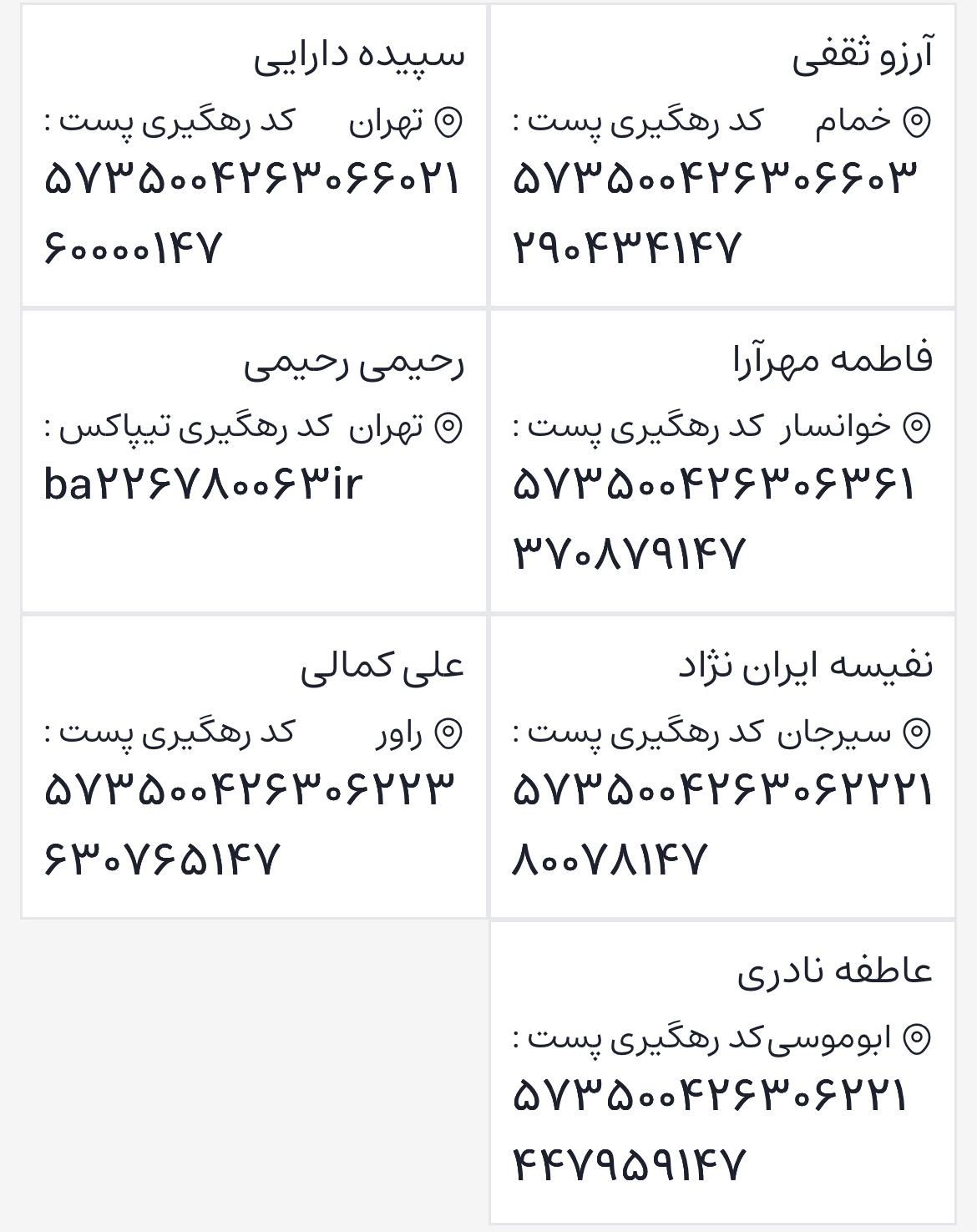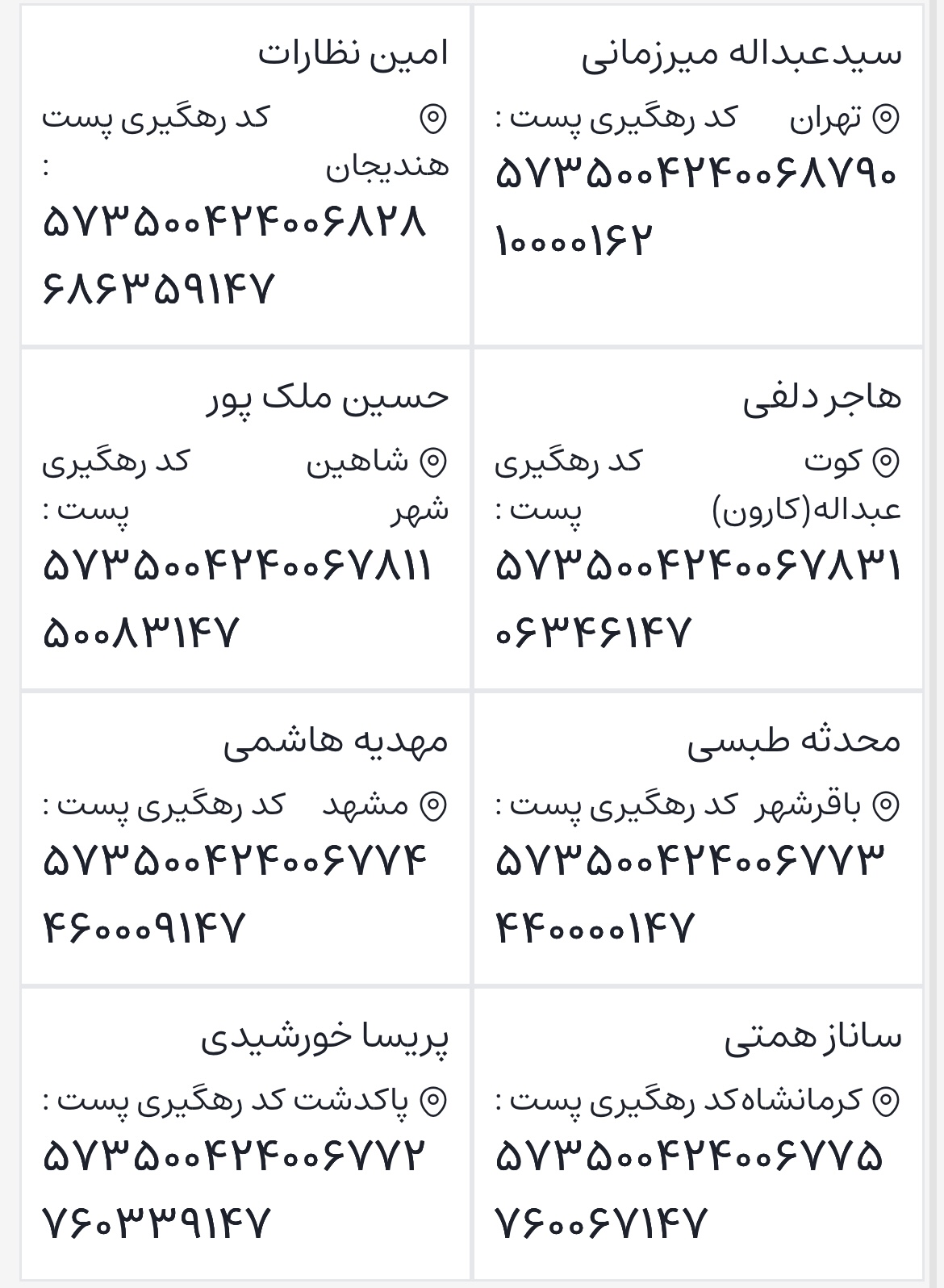 با سلام و وقت بخیر، شما عزیزان میتونید با استفاده از کد رهگیری از طریق سامانه رهگیری مرسولات پستی و سامانه تیپاکس، سفارش خودتون رو پیگیری کنید و بدونید دقیقا کجاست.