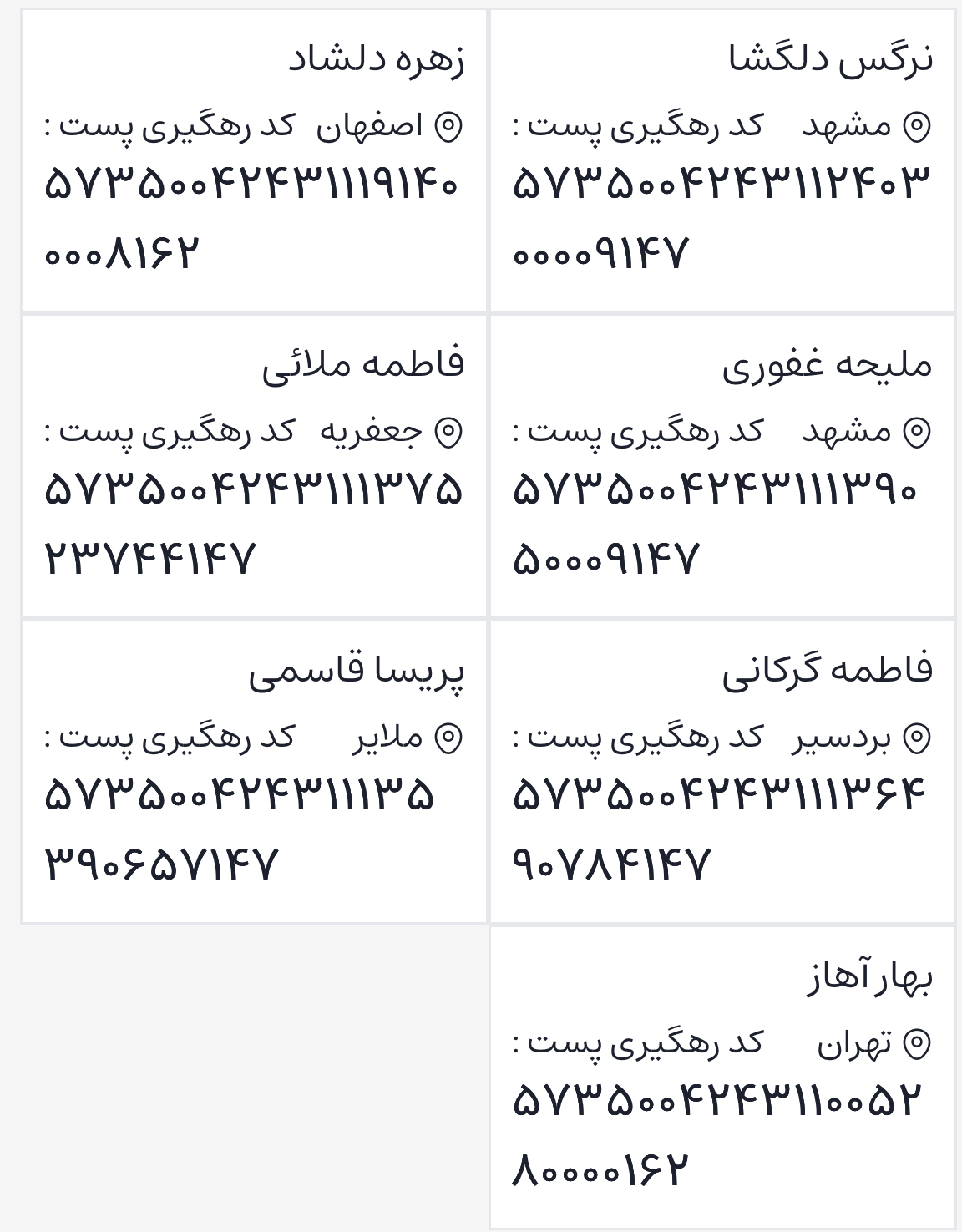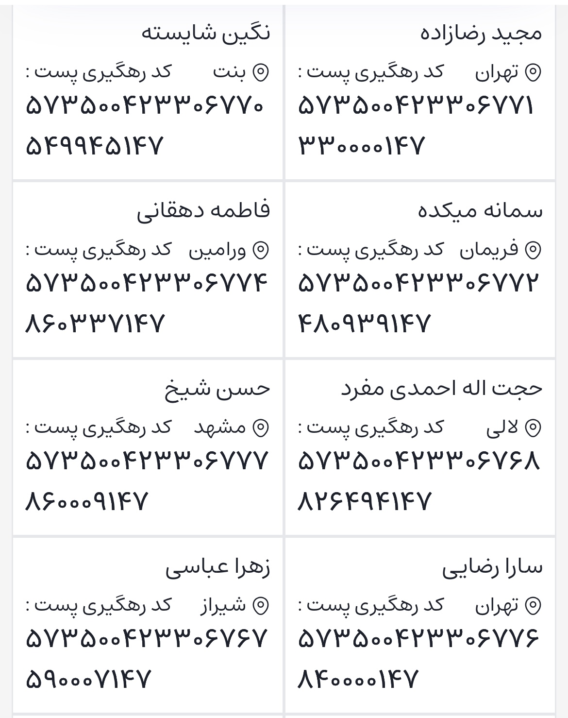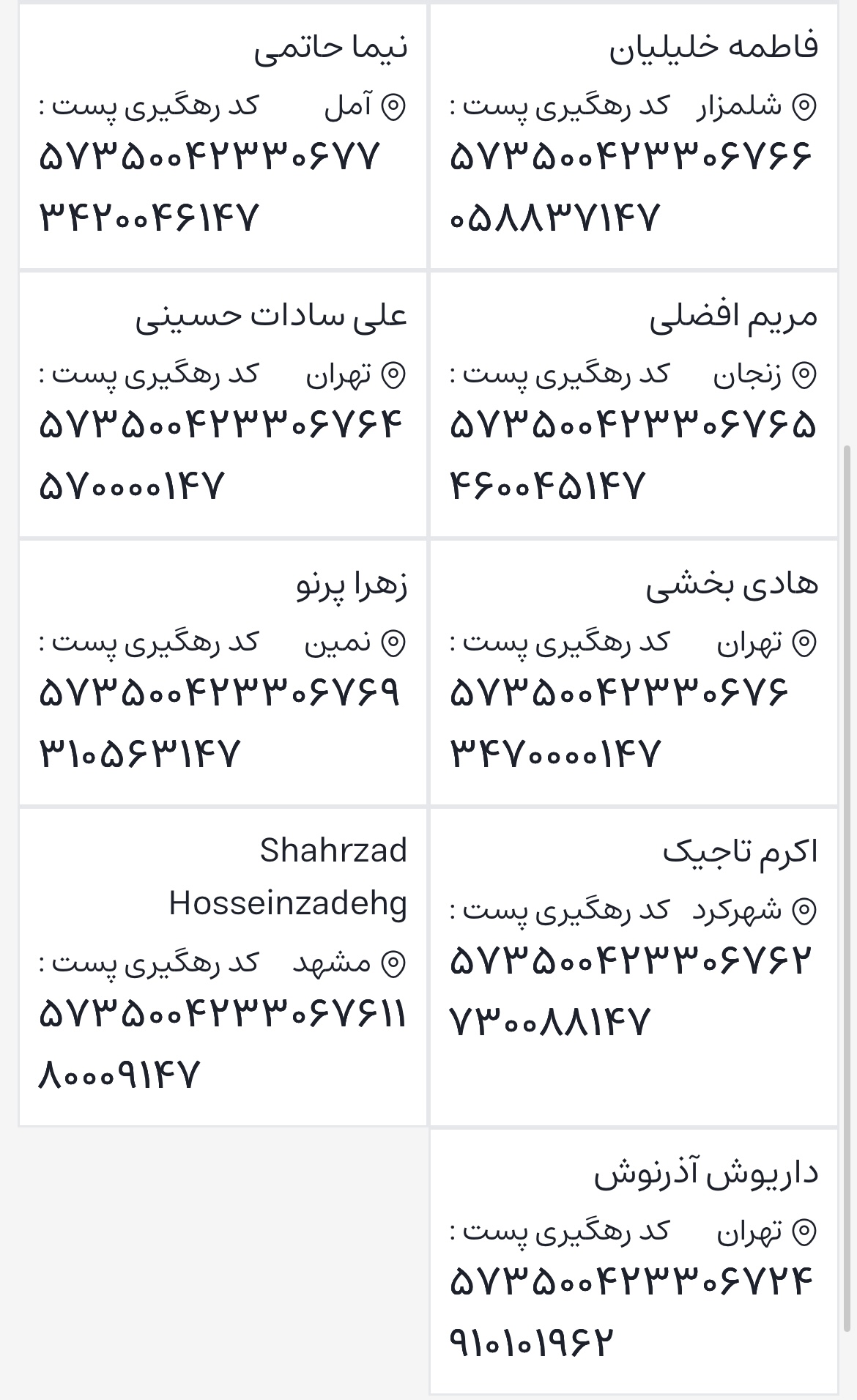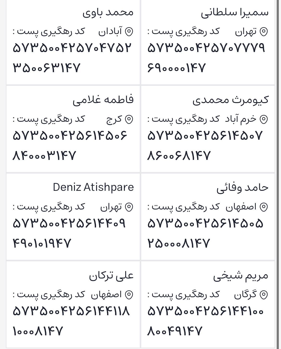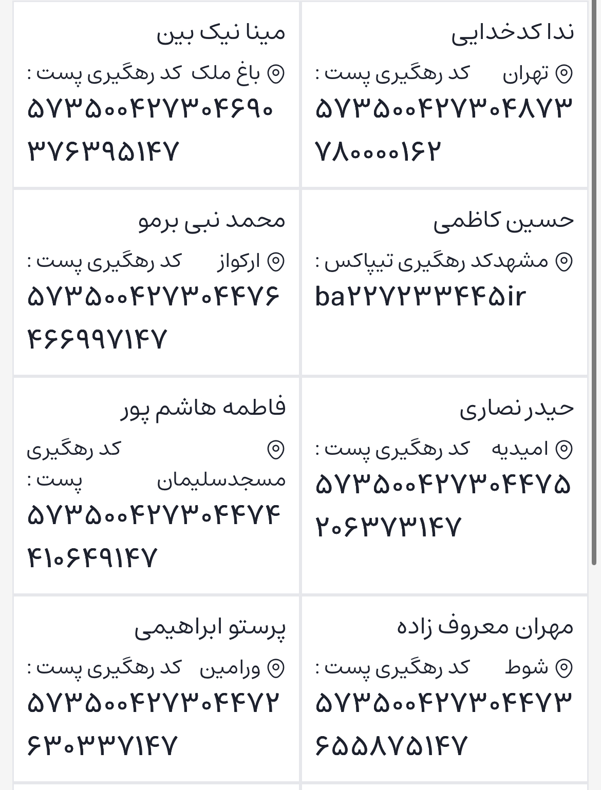 با سلام و وقت بخیر، شما عزیزان میتونید با استفاده از کد رهگیری از طریق سامانه رهگیری مرسولات پستی و سامانه تیپاکس، سفارش خودتون رو پیگیری کنید و بدونید دقیقا کجاست.