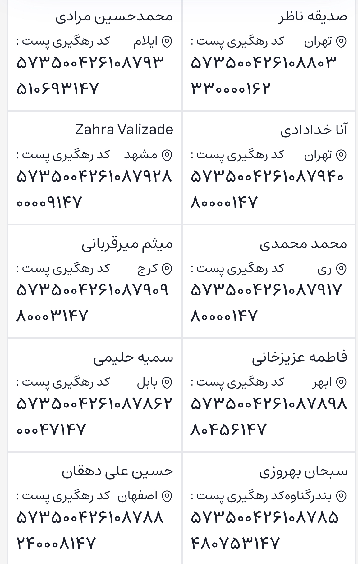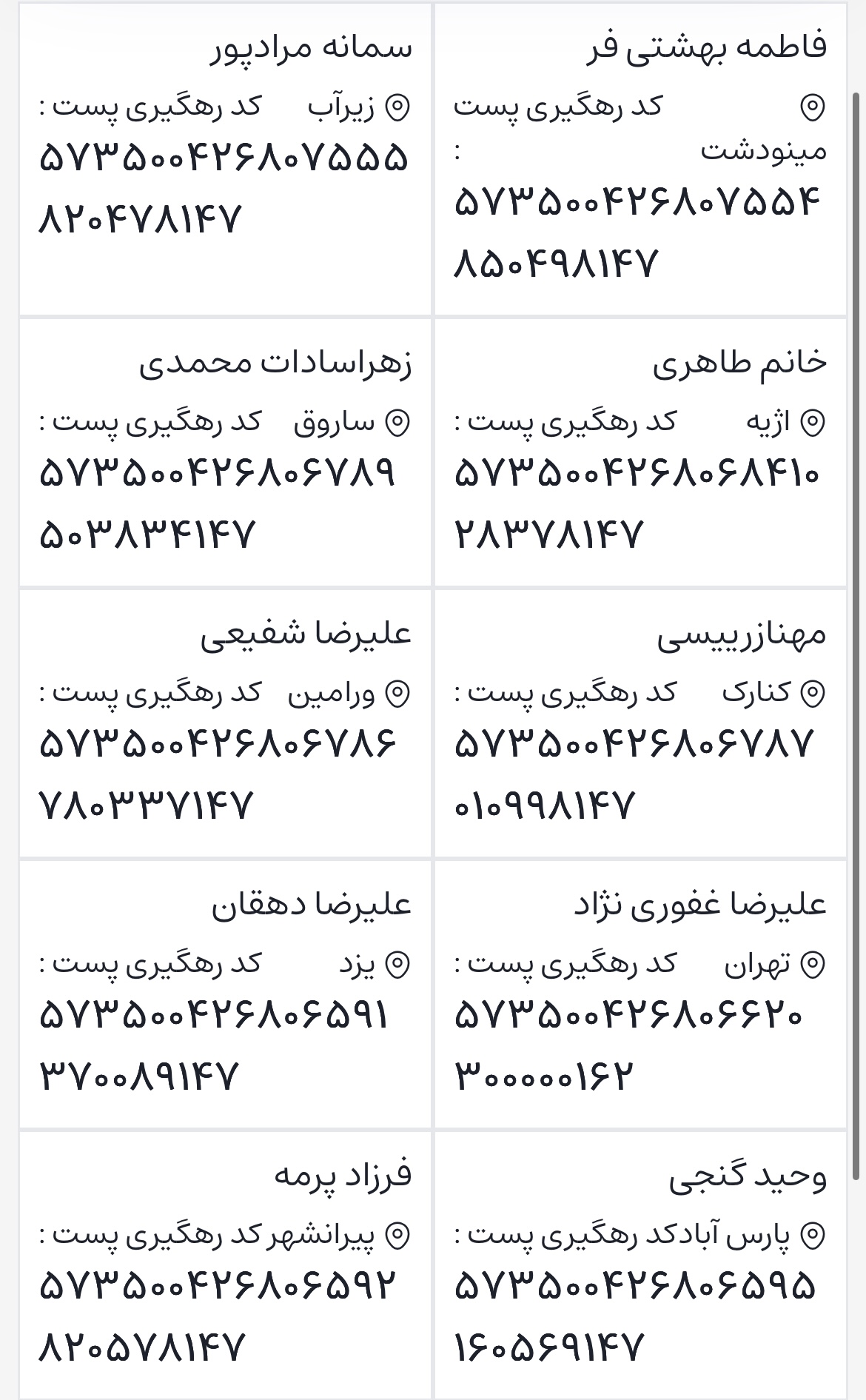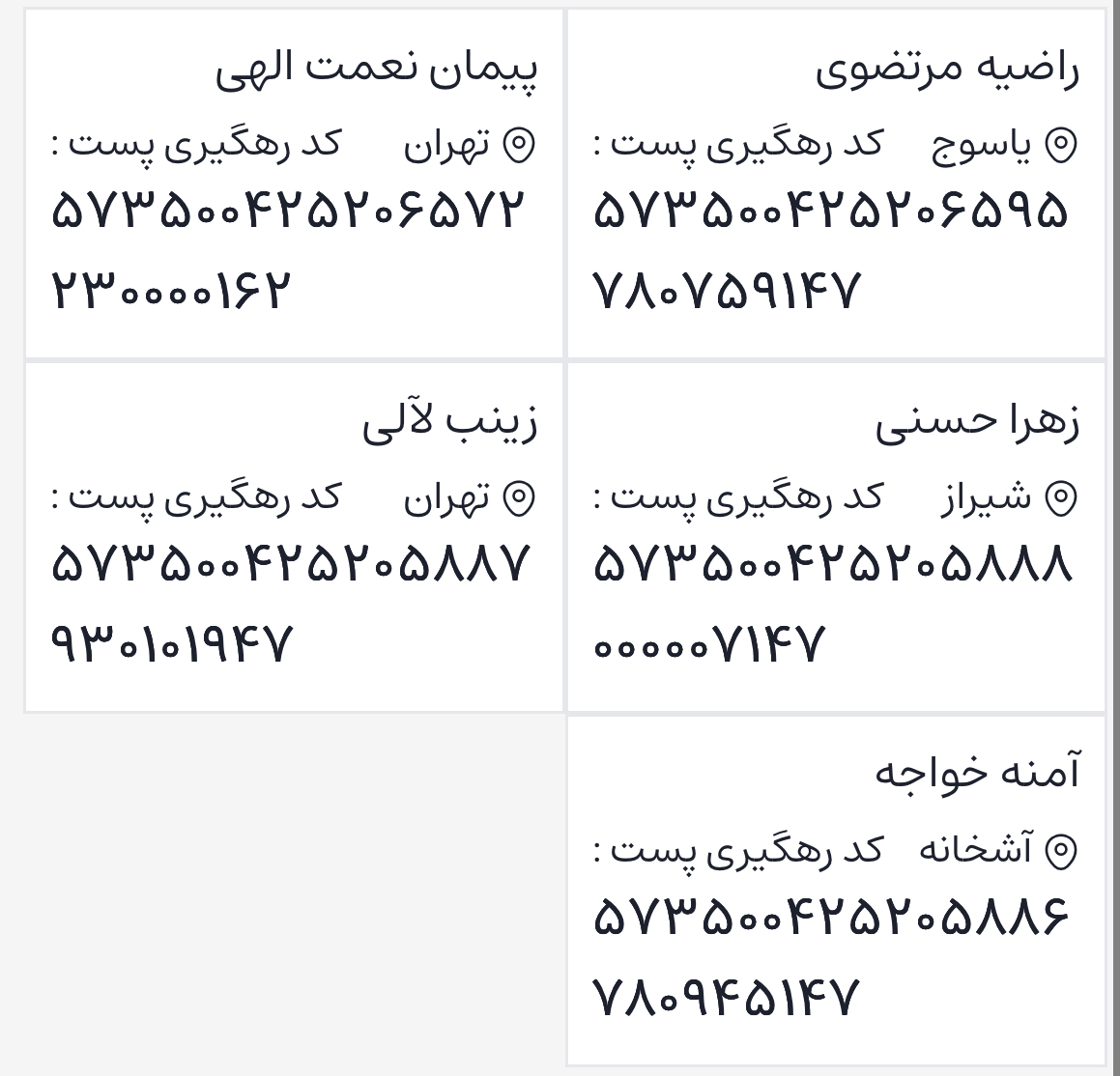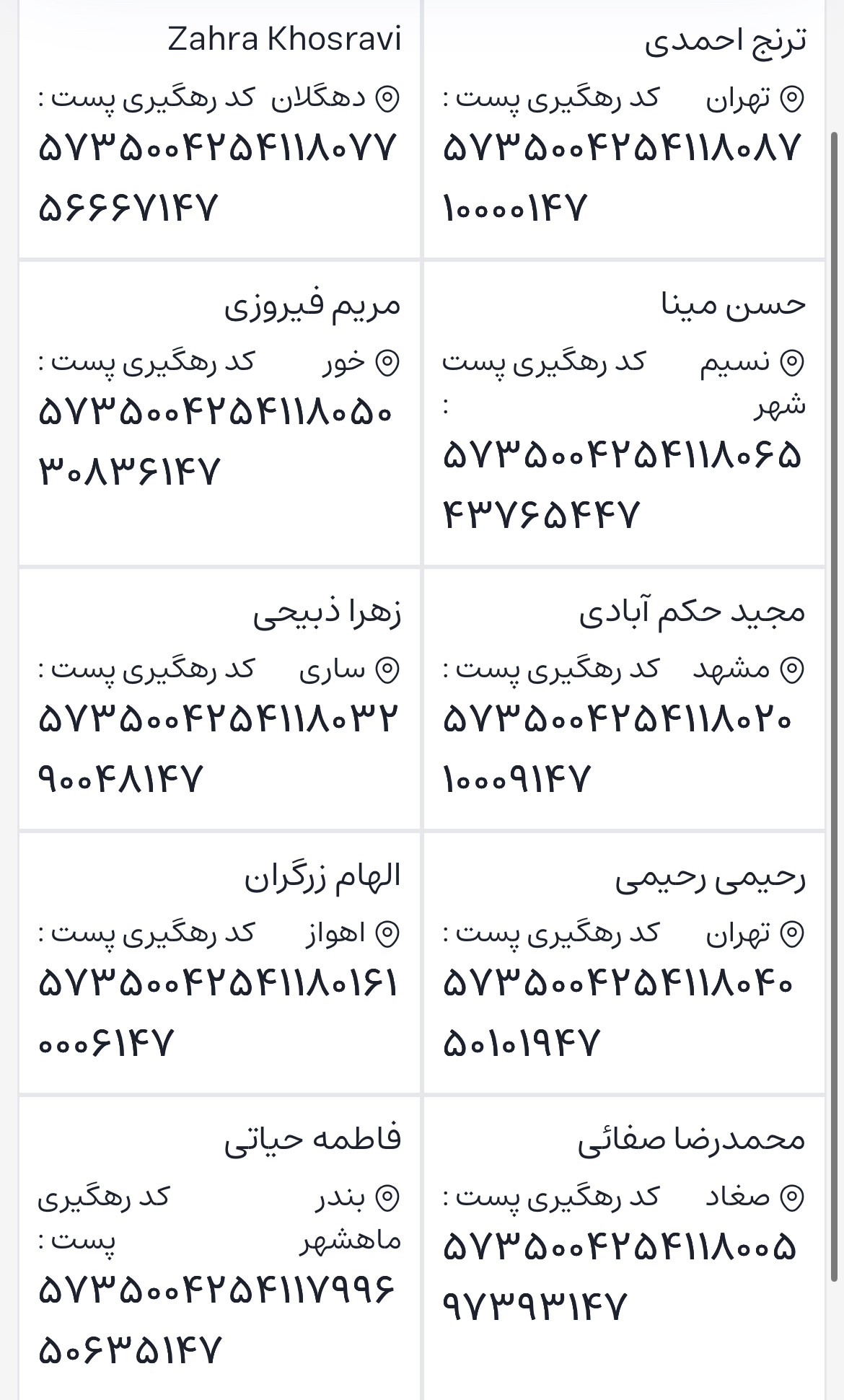 با سلام و وقت بخیر، شما عزیزان میتونید با استفاده از کد رهگیری از طریق سامانه رهگیری مرسولات پستی و سامانه تیپاکس، سفارش خودتون رو پیگیری کنید و بدونید دقیقا کجاست.
