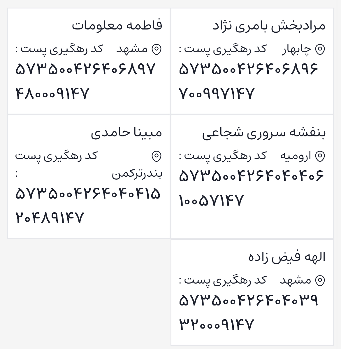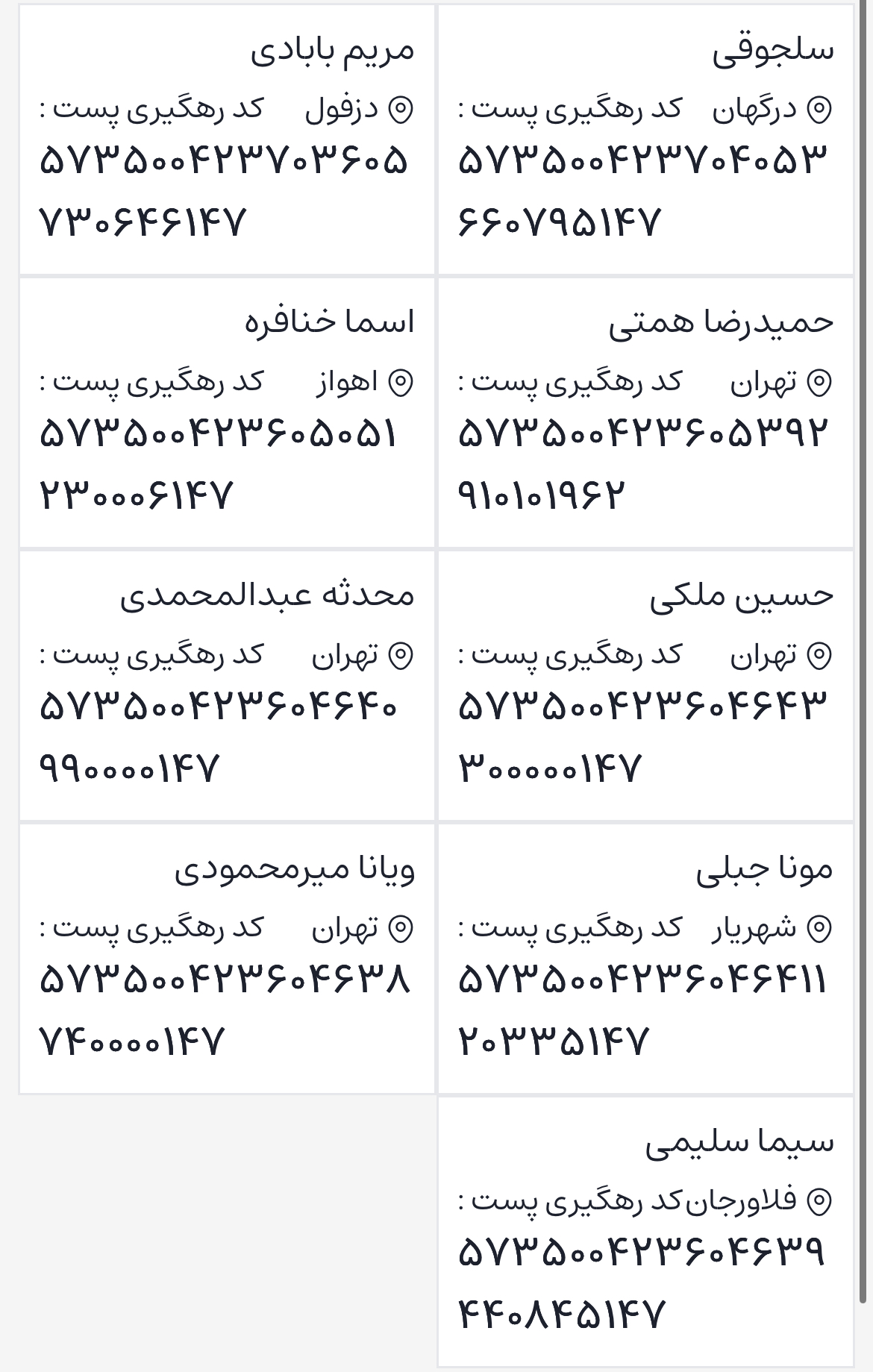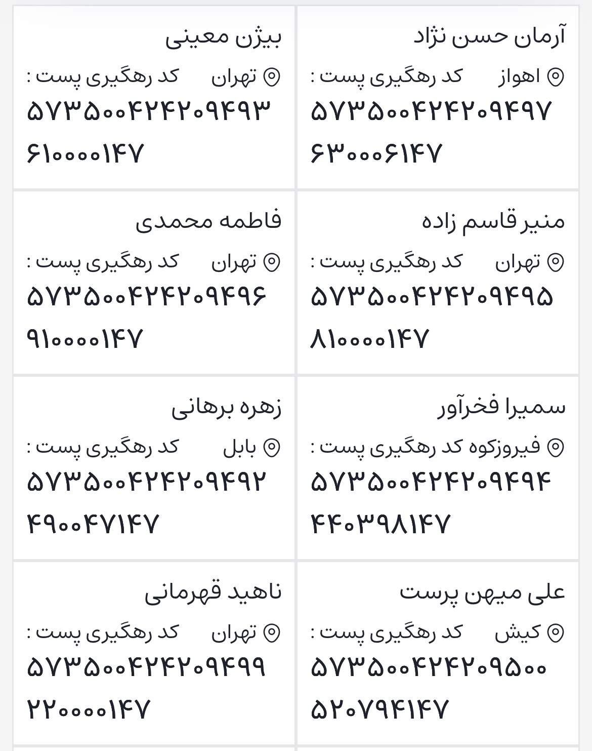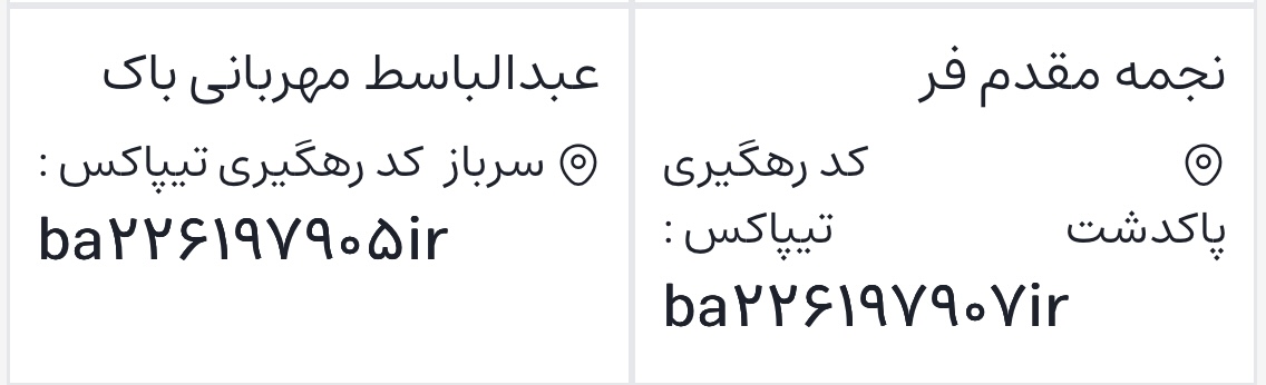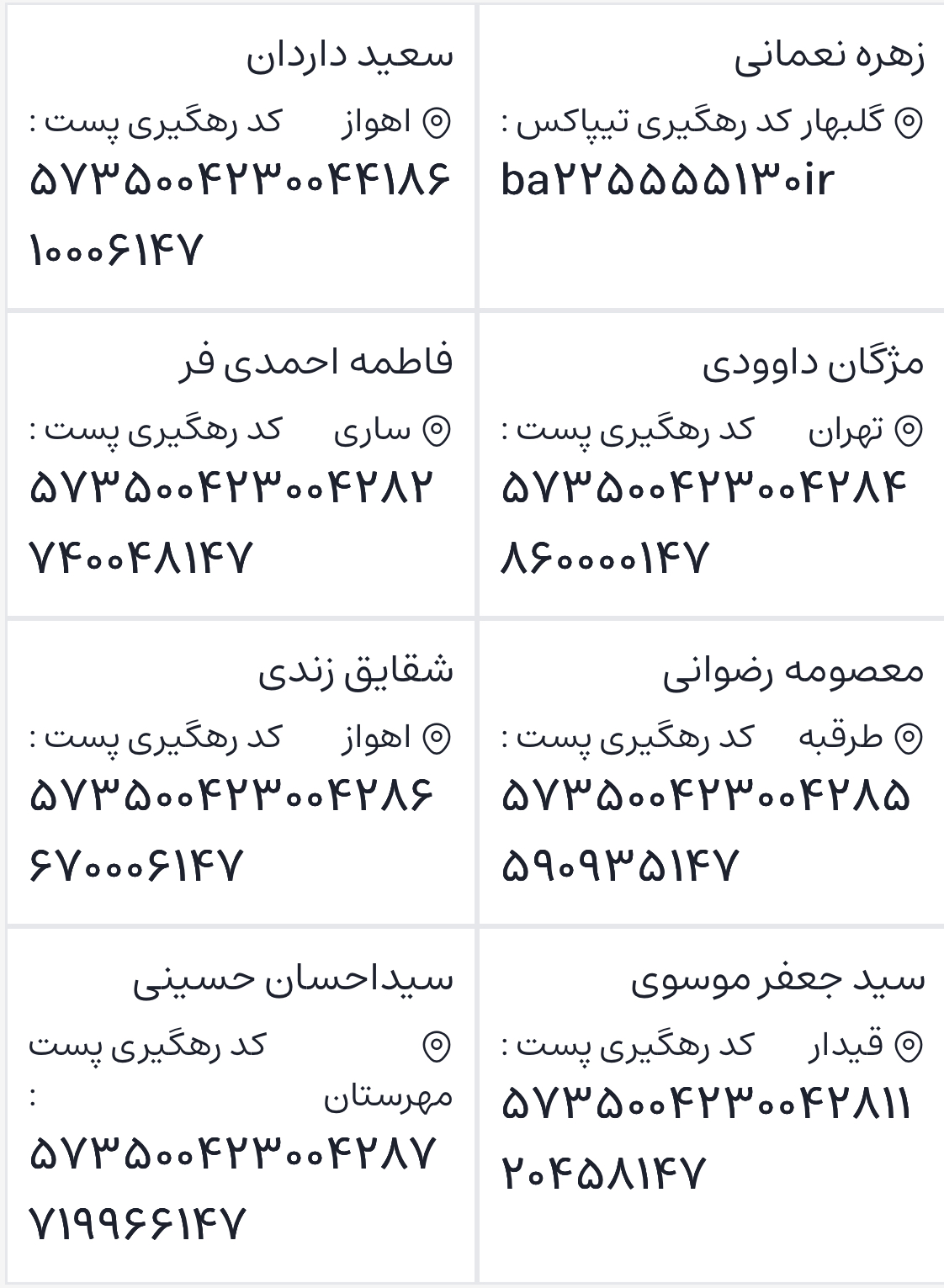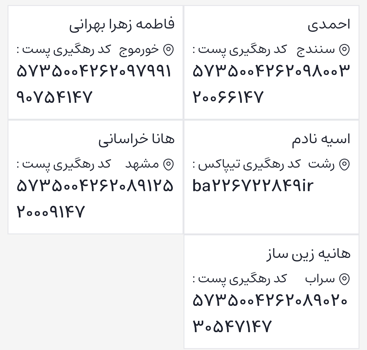 با سلام و وقت بخیر، شما عزیزان میتونید با استفاده از کد رهگیری از طریق سامانه رهگیری مرسولات پستی و سامانه تیپاکس، سفارش خودتون رو پیگیری کنید و بدونید دقیقا کجاست.