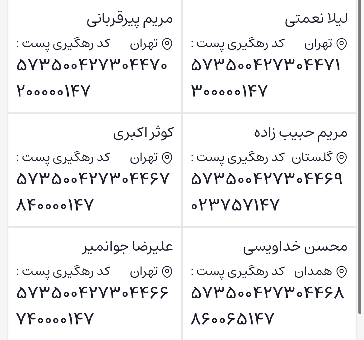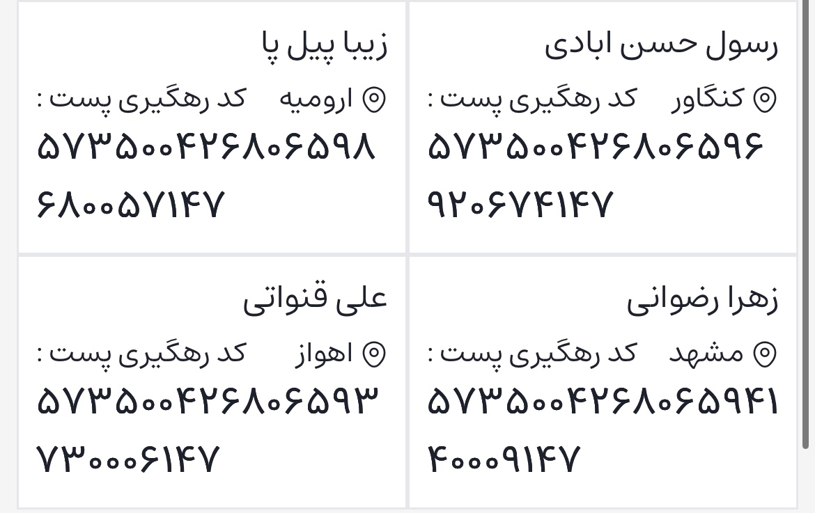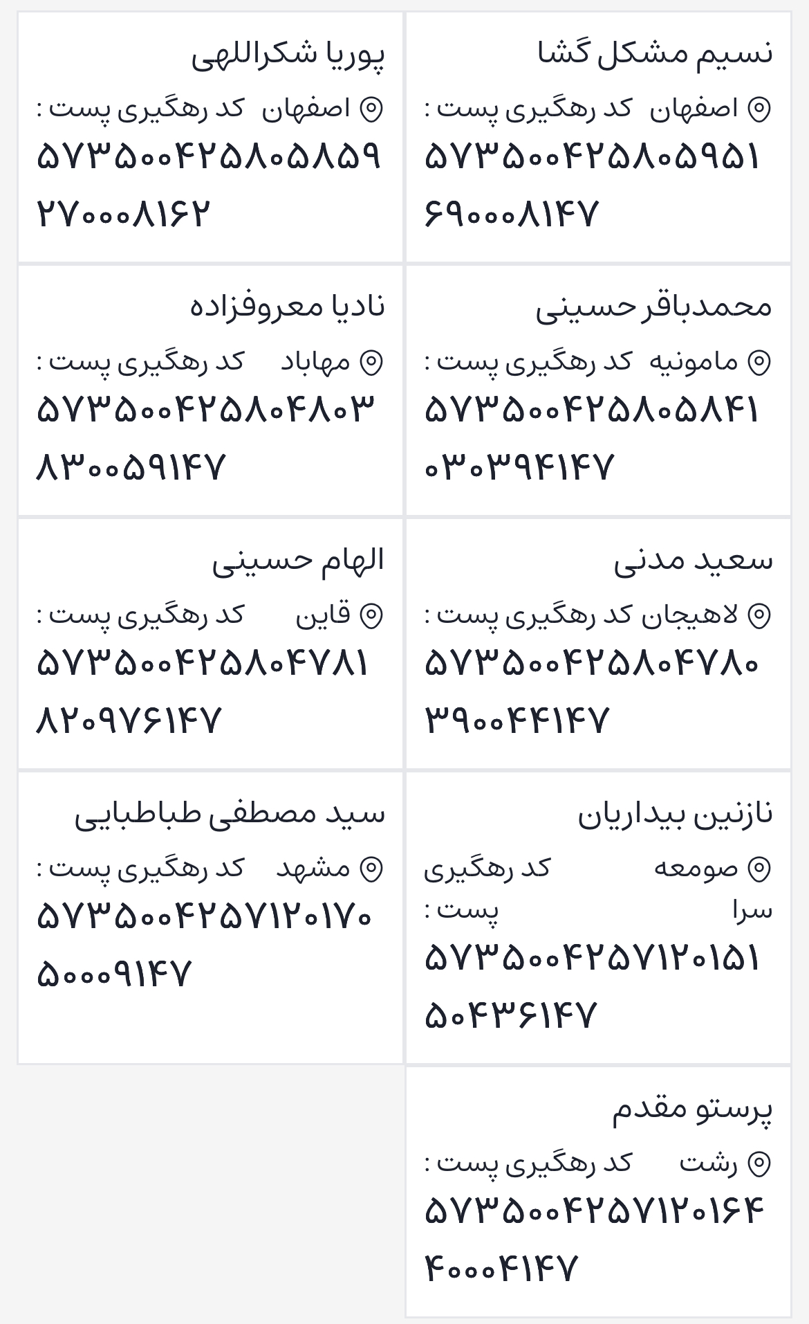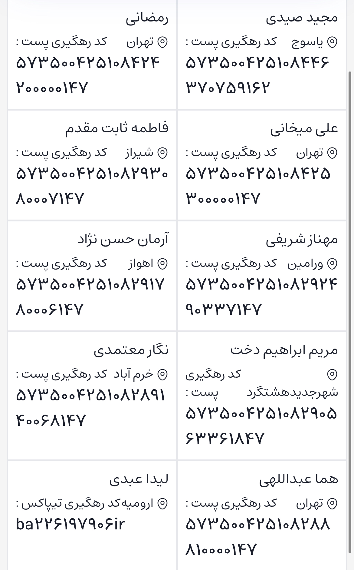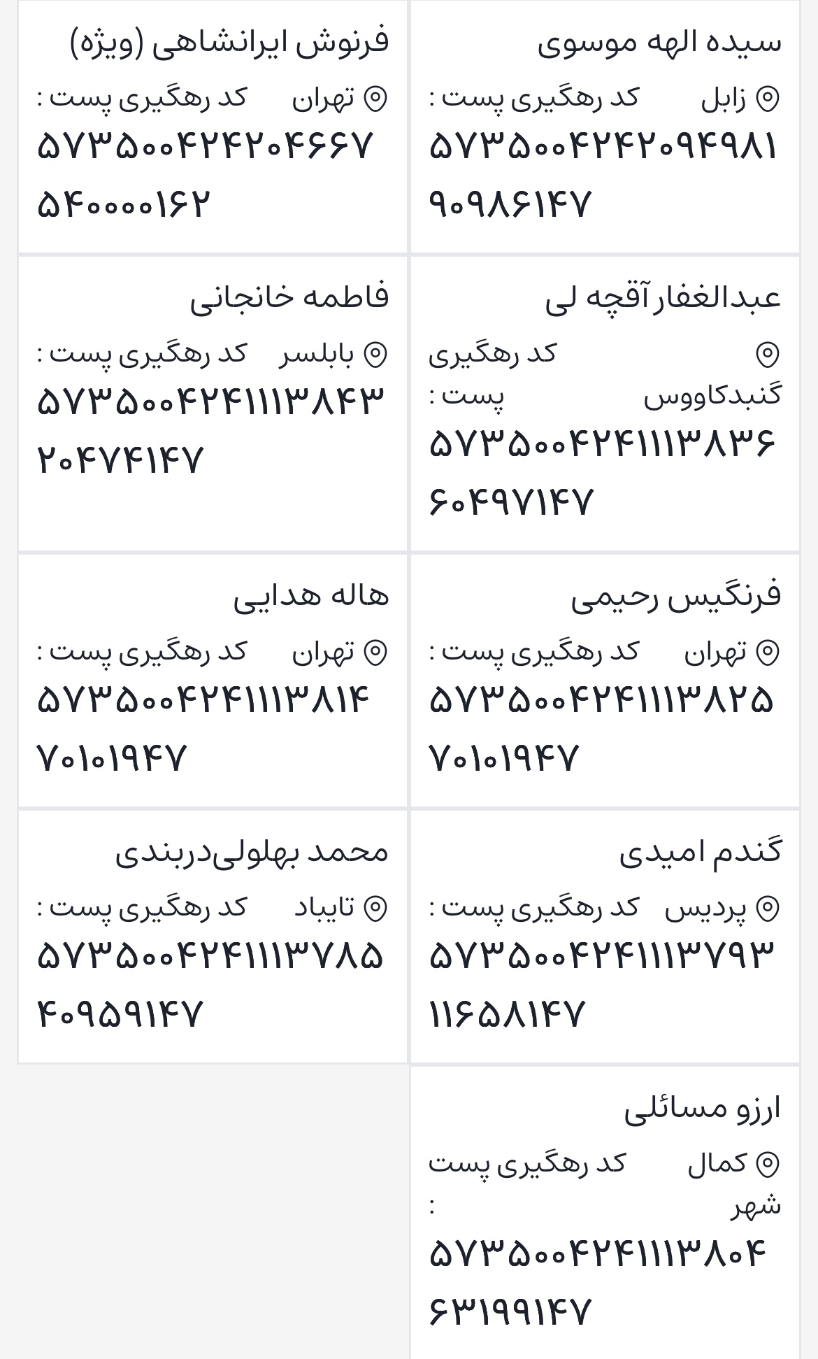 با سلام و وقت بخیر، شما عزیزان میتونید با استفاده از کد رهگیری از طریق سامانه رهگیری مرسولات پستی و سامانه تیپاکس، سفارش خودتون رو پیگیری کنید و بدونید دقیقا کجاست.